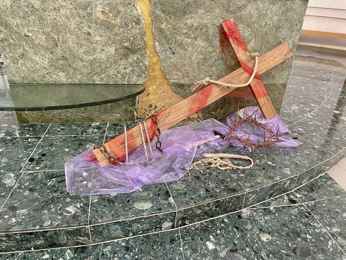 Kovaná reťaz a klince symbolizujúce ukrižovanie Ježiša v kostole Kráľovnej pokoja v Prešove