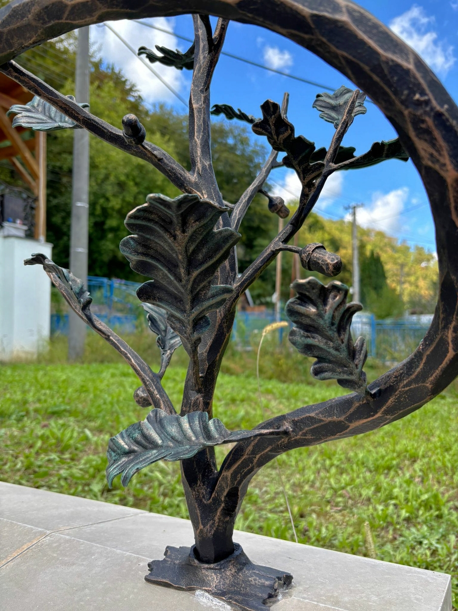 Detail kovanej bránky s dubovými vetvičkami - dizajnové oplotenie